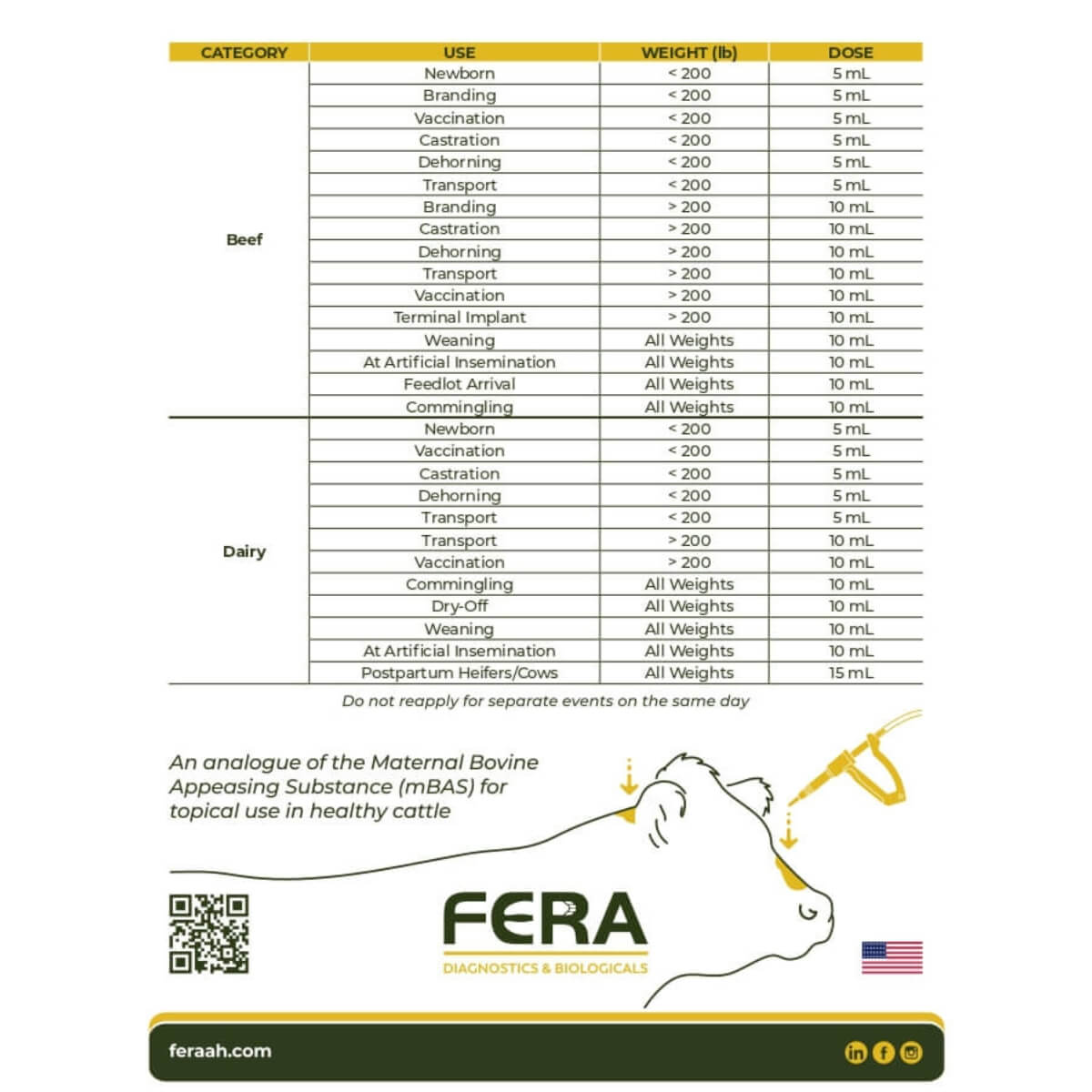 FerAppease can and should be used every time animals are exposed to management and physiological stressors, where suppression of threat perception is desirable including at weaning, dehorning, castration, branding, transportation, commingling, vaccination, parturition, interruption of lactation (dry off), and breeding.